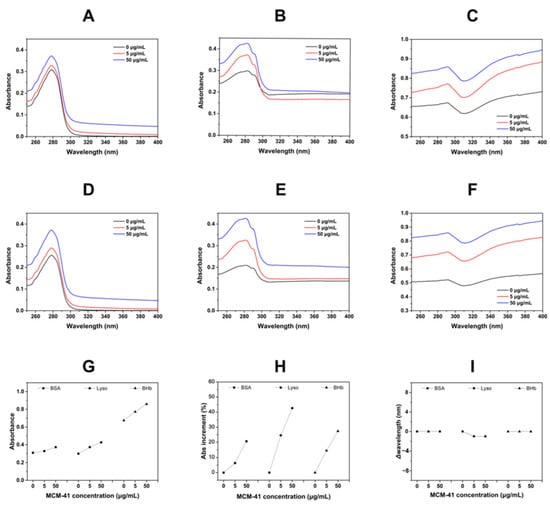 As shown in Figure 2, when BSA, Lyso, and BHb were incubated with MCM-41, the Abs of the three proteins was all increasing with the increment of MCM-41 concentration. The Abs of BSA increased from 0.31 to 0.37, that of Lyso increased from 0.30 to 0.43 and that of BHb increased from 0.67 to 0.86. Figure 2D–F showed the normalized UV spectra. There was no significant change in the peak wavelength of three proteins incubated with MCM-41 (Figure 2I). However, the percentages of Abs increment of BSA, Lyso, and BHb were different (Figure 2H). The Abs increments of proteins were related to the exposure of protein chromophores. The proteins’ interaction with MCM-41 might have led to the exposure of chromophores that were originally hidden inside the proteins, and with the increase of MCM-41 concentration, this interaction was intensified, leading to more exposure of chromophores, and thus, UV absorption was increased. The above results indicated that there might be different interactions between MCM-41 and three proteins.