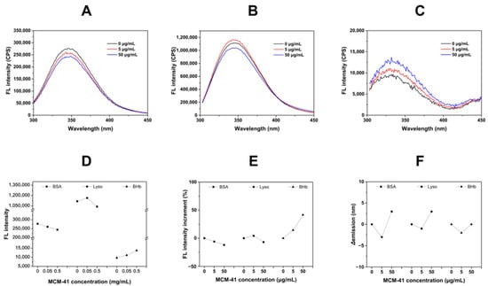 Then, the changes in emission wavelength (Δemission) were summarized in Figure 2F. A noticeable red-shift (3 nm) was observed in the fluorescence emission spectra of BSA and Lyso with 50 μg/mL MCM-41. The change in the surrounding microenvironment of Trp residues might be responsible for this type of peak shift []. It was suggested that BSA and Lyso had undergone conformational changes, affecting the microenvironment in which the Trp residues of the protein were located. The red-shift indicated that the tryptophan residues in BSA and Lyso were in a more hydrophilic environment after interaction with MCM-41, which could be due to BSA and Lyso adsorption on the hydrophilic surface of MCM-41. Since BSA and Lyso adsorbed on the hydrophilic surface of MCM-41, the polarity of the hydrophobic tryptophan microenvironment changed as the protein conformation changed. In contrast, the fluorescence emission of BHb did not appear red-shift and Figure 3C showed that the fluorescence intensity of BHb increased with the concentration of MCM-41. It was indicated that the MCM-41-BHb interaction could not lead to changes in the Trp residue microenvironment and fluorescence quenching, demonstrating that BHb might not be tightly adsorbed on the hydrophilic surface of MCM-41 and have the weaker interaction with MCM-41 than BSA and Lyso. Hence, it was suggested that the interaction force followed the rank of MCM-41-BSA > MCM-41-Lyso > MCM-41-BHb. In summary, the interactions between MCM-41 and the three proteins were different, which led to different behaviors of fluorescence.