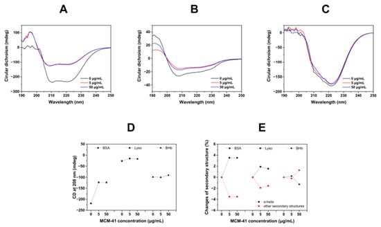 Moreover, changes in the conformational structure of proteins adsorbed on the surface of MCM-41 were investigated by CD spectra. CD spectroscopy had been widely used to analyze changes in protein secondary structure []. For example, Andra et al. investigated the secondary structure rearrangement of BSA after interaction with GO-PAMAM using CD spectroscopy. Additionally, they found that this interaction promoted the rearrangement of the protein backbone, leading to strongly twisted β-sheet secondary structure architecture []. As shown in Figure 4, we could observe two negative bands at 208 and 220 nm, the values of which were considered characteristic absorption peaks of the α-helix of protein. Then, the ellipticity value at 208 nm was summarized in Figure 3D. As shown in Figure 4A, after incubating with MCM-41, the absorption intensity of the CD band changed significantly and the ellipticity value at 208 nm was increased from −218.6 to −123.5, indicating that the interaction between MCM-41 and BSA could induce significant changes in the secondary structure of BSA. However, when Lyso and BHb were incubated with MCM-41, moderate intensity changes of Lyso (Figure 4B) and slight changes of BHb (Figure 4C) could be observed, which suggested that MCM-41 could change the secondary structure of Lyso to a moderate extent and that of BHb to a low extent. The changes of secondary structures calculated by the formula were also consistent with the above results (Figure 4E). Therefore, it was indicated that three proteins had different interaction levels with MCM-41, and it was reasonable that the intensity of interaction between proteins and MCM-41 ranked as BSA > Lyso > BHb.