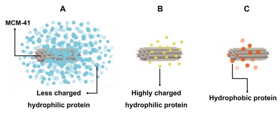 According to the above results, we hypothesized that there might be three patterns of interaction between MCM-41 and proteins (Figure 6). Firstly, BSA might follow a strong interaction pattern. It might have a strong interaction with MCM-41, which would decrease the fluorescence intensity of BSA and form a quenching complex, and as the concentration of MCM-41 increased, the amounts of bound proteins would increase, and the degree of fluorescence quenching would also increase. Additionally, this strong interaction pattern might lead to the results of strong secondary structure changes of BSA and its high adsorption capability on MCM-41. Secondly, Lyso might follow the moderate interaction pattern. It might interact with MCM-41 with moderate intensity, and only in the presence of high concentrations of MCM-41 could the fluorescence intensity of Lyso be inhibited, resulting in fluorescence quenching of Lyso. Additionally, this moderate interaction pattern might cause the consequences that the secondary structure change of Lyso was medium and its adsorption capability on MCM-41 was lower than BSA. Thirdly, BHb might follow a weak interaction pattern. It might have a weak interaction with MCM-41, the fluorescence intensity of BHb would not be suppressed without the formation of a quenching complex, and the fluorescence intensity would increase with the increase of MCM-41 concentration. Additionally, this weak pattern might result in smaller changes in BHb secondary structure and its weaker adsorption capability.