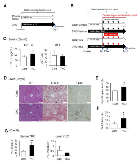 The 7KC-containing high-fat/high-cholesterol/high-sucrose/bile salt diet exacerbated steatohepatitis in C57BL/6 mice. (A) Experimental protocol before induction of psoriasis-like dermatitis. Samples were harvested on Day 0. (B) Experimental protocol after induction of psoriasis-like dermatitis. Samples were harvested on Day 1 and Day 4. (C) TNF-α and alanine aminotransferase (ALT) in serum on Day 0. n = 6, Control; n = 6, 7KC. (D) Hematoxylin and eosin (H.E.) staining, oil red O (O.R.O) staining, and F4/80 staining of liver samples on Day 0. Scale bar: 100 μm. (E) Areas with oil red O staining in the liver. n = 6, Control; n = 6, 7KC. (F) Areas with F4/80 staining in the liver. n = 6, Control; n = 6, 7KC. (G) 7KC concentrations in serum and liver of mice on Day 0. n = 5, Control; n = 5, 7KC. Results are presented as mean ± SD, and p values were calculated using Student’s t-test. * p < 0.05, ** p < 0.01, and *** p < 0.001, Control vs. 7KC.