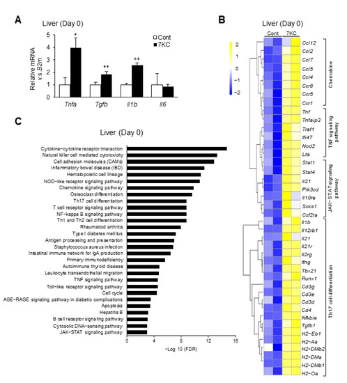 The 7KC-containing diet enhanced inflammatory responses in the liver. (A) mRNA expression of inflammatory genes was examined on Day 0 using quantitative PCR. Mean expression in the control group, obtained by correcting each CT value with the respective housekeeping gene, was used as a control (one) to indicate the relative expression. Results are presented as mean ± SD, and p values were calculated using Student’s t-test. * p < 0.05, and ** p < 0.01, Control vs. 7KC. n = 3, Control; n = 3, 7KC. (B) RNA sequence analysis of liver samples collected on Day 0. Heatmaps of genes associated with chemokines, TNF signaling pathway, JAK-STAT signaling pathway, and Th17 cell differentiation in the liver were identified. (C) Analysis of pathways in the liver on Day 0. Pathways with upregulated expression in the 7KC versus Control group are shown.