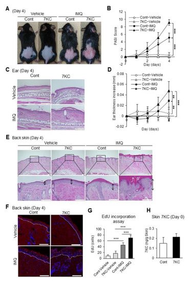 Next, we examined whether exacerbating steatohepatitis using 7KC enhanced imiquimod-induced psoriasis-like dermatitis. After feeding mice on the NASH or 7KC diets for three weeks, control cream (vehicle) or 5% imiquimod cream (IMQ) was applied daily for four days to the right ear and dorsal skin (Figure 1B). In the IMQ group, mice on the 7KC diet showed psoriasis-like dermatitis, accompanied by more severe erythema and desquamation compared with mice on the NASH diet (Figure 3A). These phenotypes were not observed in the vehicle-treated group (Figure 3A). The degree of erythema and desquamation was quantified by calculating the psoriasis area severity index (PASI) score based on the condition of psoriasis-like dermatitis caused by erythema, desquamation, and thickening [25]. Compared with mice in the vehicle group fed with the NASH diet (Cont-Vehicle), the IMQ group fed with the NASH diet (Cont-IMQ) showed a marked increase in PASI scores on Day 4, suggesting that IMQ treatment successfully induced psoriasis-like dermatitis (5.17 ± 1.17 vs. 0.44 ± 0.73; p < 0.0001; Figure 3B). Importantly, the PASI score was significantly higher in the IMQ group fed with the 7KC diet (7KC-IMQ) compared with the Cont-IMQ group (9.14 ± 0.75 vs. 5.17 ± 1.17; p < 0.0001; Figure 3B). A histological analysis of skin from the ears was also performed (Figure 3C). Consistent with the PASI score, the auricular thickness of the mice in the 7KC-IMQ group was significantly greater than that in the Cont-IMQ group on Day 4 (0.029 ± 0.016 mm vs. 0.048 ± 0.017 mm, p < 0.001; Figure 3D). In contrast, there were no differences between mice in the 7KC-Vehicle and the Cont-Vehicle groups (Figure 3D). In the dorsal lesion, the epidermal thickness was also markedly greater in the 7KC-IMQ group (Figure 3E). Next, we examined the proliferation process using the 5-ethynil-2’-deoxyuridine (EdU) proliferation assay, which allows the detection of dividing and/or proliferating cells. Mice were injected with EdU on Day 4, sacrificed, and the EdU assay was performed on the dorsal lesions. The number of EdU-positive cells in the epidermal layer was significantly higher in the 7KC-IMQ group than in the Cont-IMQ group, suggesting that 7KC promotes the proliferation of the basal layer of the dorsal lesion (Figure 3F,G). The direct effect of the accumulation of 7KC was assessed by measuring the concentration of 7KC in the dorsal lesion using LC/MS–MS prior to IMQ treatment (Day 0). There was no significant difference between the control and 7KC groups (Figure 3H), suggesting that the 7KC-inducing inflammatory response in the liver and serum might promote psoriasis-like dermatitis following the application of IMQ.