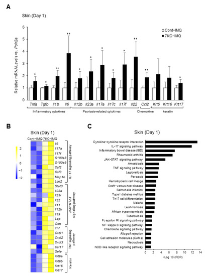 The mRNA expression of psoriasis-related cytokines at the site of IMQ-induced psoriasis-like dermatitis peaked 1–3 days after induction, before decreasing [26]. Therefore, we performed a quantitative PCR and RNA sequence analysis of samples collected on Day 1 to confirm the inflammatory response in the dorsal lesions. The expression of inflammatory cytokines such as Tnfa, Tgfb, Il6, Il12b, Il23a, Il17a, Il17c, Il17f, Il22, and Il1b was significantly upregulated in the 7KC-IMQ group (Figure 4A). The mRNA levels of inflammasome-related Nlrp3 and the macrophage-associated chemokine Ccl2 were also significantly higher in the 7KC-IMQ group (Figure 4A). The expression of Krt17, a marker of keratinocyte proliferation [27], was also significantly upregulated in the 7KC-IMQ group (Figure 4A). An RNA sequence analysis of dorsal lesion samples revealed that the IL-17A, JAK-STAT, and TNF signaling pathways and Th17 differentiation were enhanced in the 7KC-IMQ group (Figure 4B,C). The JAK-STAT signaling pathway is reportedly promoted during psoriasis [28,29]. Therefore, these results are consistent with the worsening of psoriasis-like dermatitis in the 7KC-IMQ group.