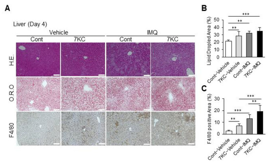 Psoriasis-like dermatitis aggravated by 7KC further accelerated steatohepatitis. (A) Hematoxylin and eosin (H.E.) staining, oil red O (O.R.O) staining, and F4/80 staining of liver on Day 4. (B) Areas with oil red O staining in the liver. n = 5, Cont-Vehicle; n = 6, 7KC-Vehicle; n = 6, Cont-IMQ; n = 6, 7KC-IMQ. (C) Areas with F4/80 staining in the liver. n = 6, Cont-Vehicle; n = 6, 7KC-Vehicle; n = 6, Cont-IMQ; n = 6, 7KC-IMQ. Results are presented as mean ± SD, and p values were calculated using one-way ANOVA with Tukey’s post hoc test. ** p < 0.01, and *** p < 0.001, Cont-Vehicle vs. Cont-IMQ, Cont-Vehicle vs. 7KC-IMQ, Cont-IMQ vs. 7KC-IMQ or 7KC-Vehicle vs. 7KC-IMQ. Scale bar: 100 μm.