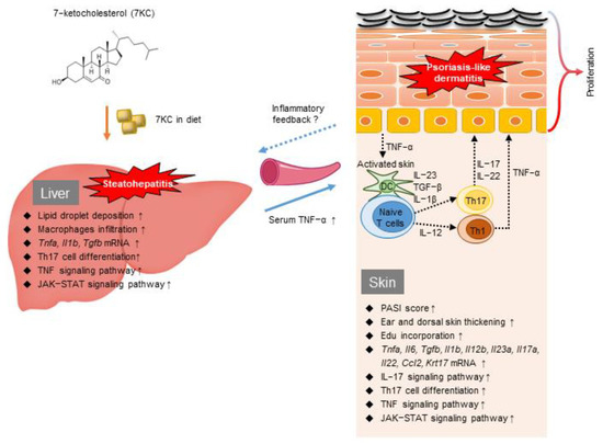 The putative mechanisms linking steatohepatitis and psoriasis-like dermatitis are summarized in Figure 6. We consider that diet-derived 7KC in the blood and liver stimulated inflammatory cells and TNF-α and IL-1b secretion, leading to Th17 cell activation. Accordingly, Tnfa, Il1b, and Tgfb mRNA expression was upregulated in the livers of mice in the 7KC group (Figure 2A). An RNA sequence analysis of liver samples revealed the activation of TNF signaling, Th17 cell differentiation, and JAK-STAT signaling pathways (Figure 2B,C). In the 7KC group, serum TNF-α was increased and spleen weight was increased, suggesting that steatohepatitis induced systemic inflammation (Figure 1C and Figure S1C). Therefore, we have considered that steatohepatitis may exacerbate IMQ-induced psoriasis-like dermatitis by elevating TNF-α through systemic inflammation. These results are consistent with those of our previous study, which was based on an obese mouse model [21]. Given that a higher frequency of Th17 cells was previously reported in the livers of nonalcoholic steatohepatitis patients [33], we used FACS to investigate whether the Th17 cell fraction was higher in the blood of this mouse model. No significant change was observed in this model. We assumed that Th17 cells are localized in the liver and skin. Conversely, an RNA sequence analysis of dorsal skin samples revealed that Il23a, Il17a, and Il22 expression was upregulated on Day 1 in the 7KC-IMQ group compared with the Cont-IMQ group (Figure 4A), indicating that the JAK-STAT and IL-17 signaling pathways and Th17 cell differentiation were activated in the 7KC-IMQ group compared with the Cont-IMQ group (Figure 4B,C). These results suggest that pre-feeding with 7KC diets induces greater dynamic inflammatory responses in the skin, although previous experiments using IMQ have demonstrated a dramatic induction of inflammation [26,34,35]. Interestingly, the 7KC-mediated promotion of TNF-α secretion from inflammatory cells in the skin may trigger an inflammatory loop between the liver and skin, contributing to the promotion of psoriasis-like dermatitis. A couple of studies indicated that oxysterols could bind to oxysterol-binding proteins (OSBP) and circulate systemically, acting directly on IMQ skin lesions. If 7KC may bind to OSBP and be transported by OSBP, then OSBP might be a potential therapeutic target against both steatohepatitis and psoriasis.