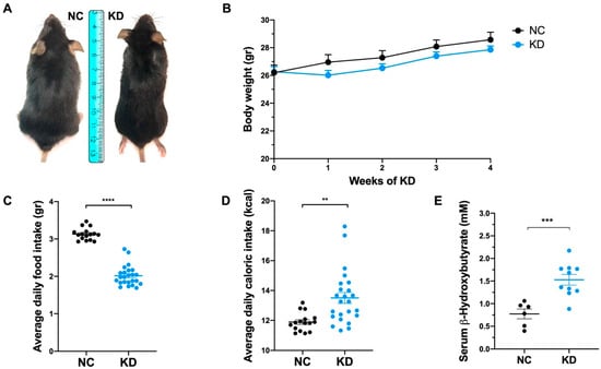 As demonstrated by the measurement of serum βHB levels, ketosis was achieved and βHB concentration was significantly increased in KD-fed mice compared to NC-fed mice at the end of dietary treatment (Figure 1E).