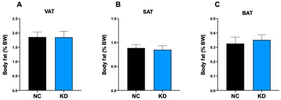 To evaluate the effect of ketosis on fat mass we determined the fat coefficient of the adipose tissue depots in KD-fed mice and NC-fed mice. This analysis revealed that 4-week ketosis is not able to trigger any change in adipose tissue depot weight, either white visceral adipose tissue (VAT) (Figure 2A), white subcutaneous adipose tissue (SAT) (Figure 2B) or brown interscapular adipose tissue (BAT) (Figure 2C).