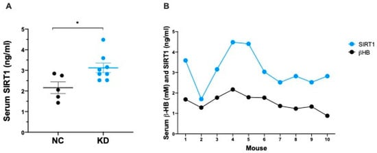 (A) Dot plot showing SIRT1 concentration (ng/mL) in serum from mice under NC (n = 5) and KD (n = 8) at the end of dietary treatment. Data are expressed as mean ± SEM. * p < 0.05. (B) Pearson correlation analysis between serum βHB and SIRT1 levels in mice under KD (n = 10). r = 0.732, p = 0.0156.