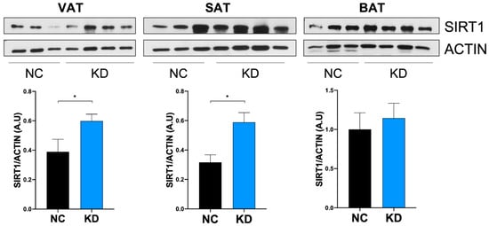 Adipose tissue represents the central metabolic organ regulating whole body energy homeostasis. To examine the effect of ketosis on SIRT1 levels in adipose tissue, we analyzed SIRT1 expression in fat depots of KD-fed mice. As shown in Figure 4, SIRT1 protein was significantly increased in VAT and SAT of KD-fed mice compared to NC-fed mice, while SIRT1 did not appear significantly modulated by KD in BAT.