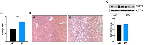 The liver plays a pivotal role in the regulation of substrate availability, and adapts its metabolic profile weekly in response to nutrients. It stores excess nutrients and exports fat during fasting, metabolizes fatty acids into ketones, and responds to metabolic consequences of a high-fat KD. As expected, the administration of a high-fat KD resulted in hepatomegaly (Figure 5A) and liver steatosis (Figure 5B), characterized by hepatocyte ballooning, and increase in lipid droplets altering the canonical histology of the liver in the KD fed mice, compared to NC fed mice. At the molecular level, liver steatosis was not associated with an increase in SIRT1 protein (Figure 5C).