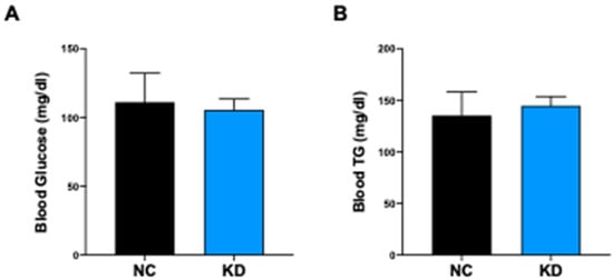 The administration of high-fat diet regimens to C57BL/6J mice triggers hyperglycemia starting from the third week of dietary treatment []. To assess if KD could exert a protective role in preventing HFD-induced hyperglycemia, we measured serum glucose levels in KD-fed mice and NC-fed mice at the end of dietary treatment. Serum fasting glucose and triglycerides were in the normal range in KD-fed mice, indicating a positive role of βHB and SIRT1 in maintaining a normal glyco-lipid profile (Figure 6A,B) despite the high intake of lipids.