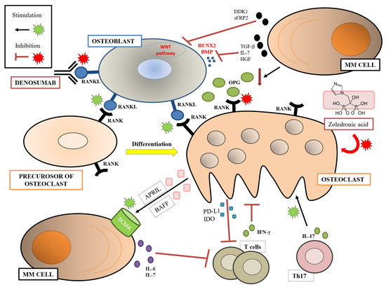 Furthermore, OCs interact with ME cells and MM cells, contributing not only to the bone disease, but also to immunosuppression and MM cell survival [17,18]. Normally, interferon-gamma (IFN-α) produced by T cells strongly suppresses osteoclastogenesis by interfering with the RANKL-RANK signaling pathway, due to the degradation of tumor necrosis factor (TNF) receptor-associated factor 6 (TRAF6) [19]. MM cells can induce an up-regulation of RANKL and a down-regulation of IFN-γ secretion by T cells through the mediation of IL-7 e IL-6 [20]. In addition, OCs interact with T cells, inhibiting their tumor activity [18]. Conversely, they are the major producer of a proliferation, inducing ligand (APRIL) and B-cell-activating factor (BAFF), which promotes MM survival through the interaction with B-cell maturation antigen (BCMA) and other receptors [21,22] and with immune inhibitor molecules of immune cells, particularly indoleamine-2,3-dioxygenase (IDO) and programmed cell death ligand-1 (PD-L1) [23]. Finally, Th17 lymphocytes seem to stimulate osteoclastogenesis via the production of interleukin-17 (IL-17) [24,25]. The main involved mechanisms are summarized in Figure 1.