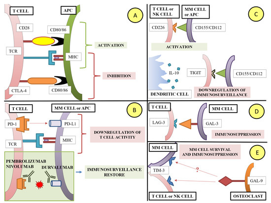 Main immune checkpoint pathway causing immune escape in MM. (Panel A) The APCs process the antigen, break it into peptides and present it in conjunction with MHC molecules on the cell surface, where it may interact with TCR. In order to proceed with T-cell activation and differentiation, APC must also express co-stimulatory molecules CD80 and CD86, also called B7.1 or B7.2, which are recognized by CD28 expressed on T cells. On the contrary, when CD80/86 binds to CTLA-4, expressed on an exhausted T cell or Tregs, T cells become anergic. (Panel B) PD-L1, expressed on APC or MM cell, binds to PD-1 expressed on a T cell, causing down-regulation of T-cell activity. The use of pembrolizumab or nivolumab (anti-PD-1 mAbs) or durvalumab (anti PD-L1 mAb) disrupts the interaction between PD-1 and PD-L1 and can hypothetically restore immune surveillance against MM cells. (Panel C) CD226, expressed on T cells, promotes the migration, activation, proliferation, differentiation, and function of CD8+ T cells. The main ligands of CD226 are CD115 and CD112; alternatively, TIGIT is an inhibitory receptor expressed on T cells and interacts with CD155 expressed on APC or tumor cells to down-regulate T-cell and NK-cell functions. IL-10 production by tolerogenic DC seems to have a role in TIGIT expression and exhaustion of T cells. (Panel D) LAG-3 is a cell surface molecule, expressed on activated T cells, NK cells, and B cells, that interacts with MHC-II to prohibit T-cell activation. MM cells can express GAL-3, which binds to LAG-3 contributing to immunosuppression. (Panel E) TIM-3 expression on T cells or NK membranes is associated with an exhausted phenotype. TIM-3 probably regulates the proliferation of MM cells via the NF-κB signal pathway. GAL-9, expressed by OCs, binds to TIM-3 and participates in inducing immunosuppression. However, the role of GAL-9 on MM cells is not clear. Abbreviations. MM, multiple myeloma; APC, antigen presenting cell; TCR, T-cell receptor; MHC, major histocompatibility complex; CTLA-4, cytotoxic T-lymphocyte-associated protein 4; PD-1, programmed death 1; PD-L1, programmed death ligand 1; IL-10, cytokine interleukin 10; TIGIT, T-cell immunoglobulin and ITIM domain; LAG-3, lymphocyte activation gene 3; GAL-9, galectine-9; TIM-3, T-cell immunoglobulin and mucin domain 3; NK, natural killer; DC, dendritic cell; mAbs, monoclonal antibodies; OC, osteoclasts.