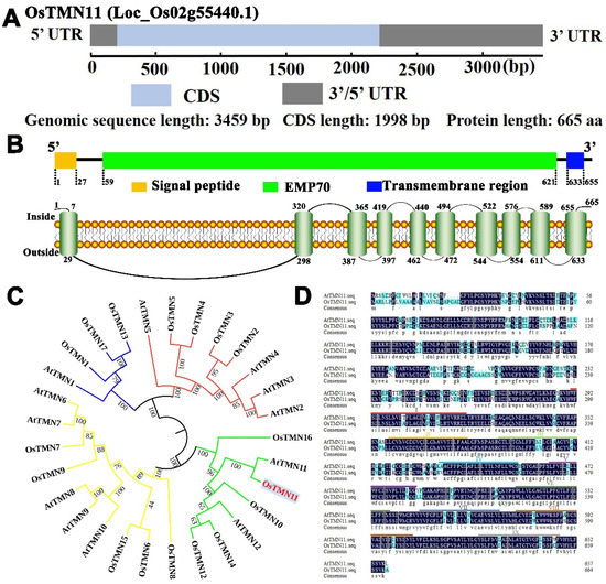 5.2. Analysis of Bioinformatics Related to OsTMN11 Gene and Protein Sequences