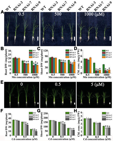 2.3. OsTMN11 Knockdown RNAi Lines Are Sensitive to Excessive Mn and Cd Ions