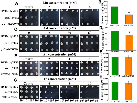2.5. OsTMN11 Can Complement a Mn-Sensitive Phenotype of Golgi-Resident pmr1 Mutant Yeast and Regulate Cellular Mn Efflux