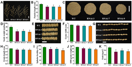 2.6. OsTMN11 Suppression Dampens Rice Growth and Development under Natural Conditions