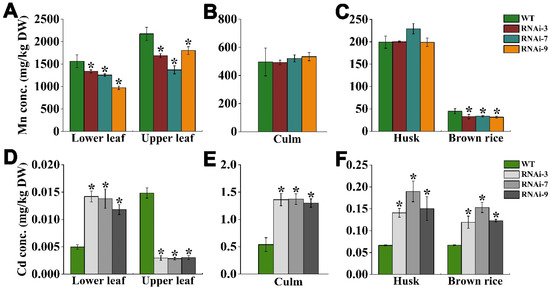 2.4. OsTMN11 Knockdown Results in Overaccumulation of Mn and Cd in Rice Plants
