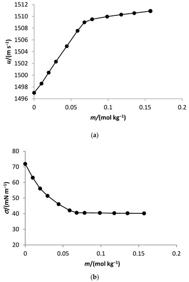 The behavior of the density, sound velocity, and surface tension at the selected temperatures of C10TAB in water follows the behavior described in the literature for the surfactants [3,4,5,6,7,8,9,10,11]. Figure 1 represents the behavior of the sound velocity and the surface tension of decyltrimethylammonium bromide in water as a function of molality at 298.15 K.