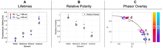 | Figure Declaration | Solvent | Relative Polarity | [ns] | [ns] | [ns] | [ns] | Single p-Value |