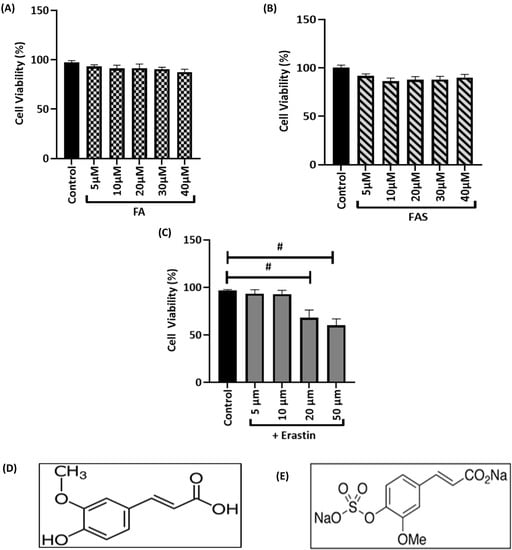 Relative cell viability of MIN6 cells against different concentrations of FA, FAS, or erastin. (A) MIN6 cells were exposed the different concentrations of ferulic acid (FA) for 24 h to determine its toxic concentration. (B) MIN6 cells were exposed to the different concentrations of ferulic acid 4-O-sulfate disodium salt (FAS) for 24 h to determine its toxic concentration. (C) MIN6 cells were treated with the indicated concentrations (5, 10, 20, and 50 μM) of ferroptosis inducer, erastin, for 24. Cell viability was measured by MTT assay. Data are presented as the percentage of cell viability with the error bars representing the SEM. (D) Chemical structure of ferulic acid (FA). (E) Chemical structure of ferulic acid 4-O-sulfate disodium salt (FAS). All the values are expressed as the mean ± SEM, n = 8. # p < 0.05 control vs. treatment groups. One-way ANOVA, Tukey’s post hoc test.