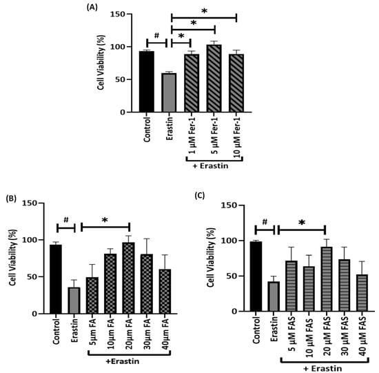 To examine the protective effect of FA and FAS treatments on erastin-induced ferroptosis in MIN6 cells, cells were treated with or without FA and FAS (5, 10, 20, 30, and 40 μM) and 20 μM of erastin for 24 h. The concentrations of phenolic acids were determined based on research related to the antioxidant effects of FA [12]. The decrease in cell viability following exposure to erastin was abolished by 20 μM of FA or FAS treatment (Figure 2B,C; p < 0.05). Moreover, when MIN6 cells were treated with different concentrations of ferroptosis inhibitor Fer-1 in the presence of 20 μM of erastin, Fer-1 was able to block the cell death caused by 20 μM of erastin (Figure 2A).