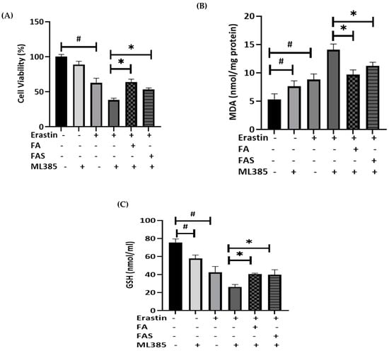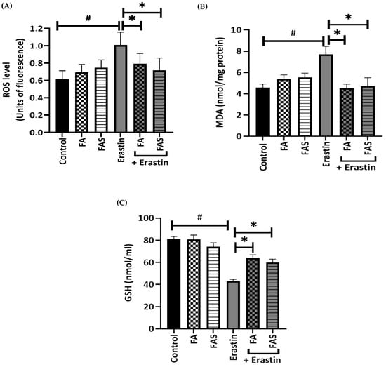 FA and FAS limit lipid peroxidation and ROS production by increasing GSH levels. Cells were treated with 20 μM of erastin in the absence and presence of 20 μM of ferulic acid (FA) or ferulic acid 4-O-sulfate disodium salt (FAS) for 24 h. Then, cellular reactive oxygen species (ROS) were estimated with a dihydrodichlorofluorescein (H2DCF) cell-permeant probe (A), lipid peroxidation levels were measured by malondialdehyde (MDA) assay (B), and glutathione (GSH) amounts were measured by total GSH assay (C). All the values are expressed as the mean ± SEM. # p < 0.05 control vs. treatment groups; * p < 0.05 erastin only vs. treatment groups. One-way ANOVA, Tukey’s post hoc test.