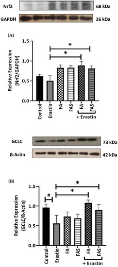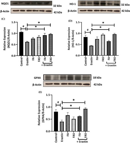 To further analyse the cytoprotective role of FA and FAS in erastin-induced ferroptosis in MIN6 cells, the protein levels of Nrf2, GPX4, HO-1, GCLC, and NQO1 were determined. Cells treated with erastin alone showed significantly reduced protein expression levels of Nrf2, GPX4, HO-1, GCLC, and NQO1 (p < 0.05) (Figure 5). On the contrary, co-treatment with FA and FAS significantly increased the expression of Nrf2, GPX4, HO-1, GCLC, and NQO1 in erastin-induced cells, thus suggesting the activation of the Nrf2 signalling pathway by FA and FAS.