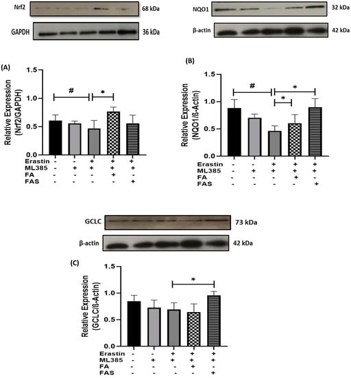 After the pre-treatment of MIN6 cells with ML385, the protein levels of Nrf2 and its downstream genes, including GCLC and NQO1, were increased in the erastin, FA, or FAS co-treatment groups compared with erastin alone (p < 0.05) (Figure 7). Collectively, these data indicate that the cytoprotective effects of FA and FAS against ferroptosis can be achieved by activating Nrf2.