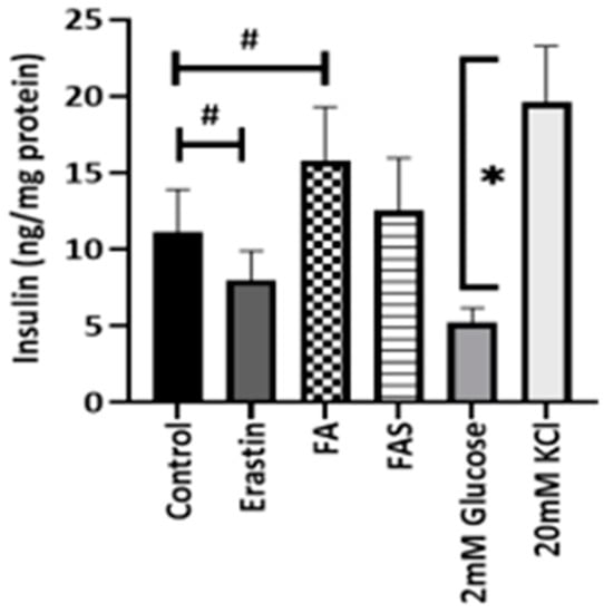 In keeping with its cytotoxic effects, the ferroptosis inducer, erastin, significantly decreased insulin secretion (p < 0.05) in MIN6 cells. However, FA effected approximately a 1.5-fold significant increase in insulin levels in MIN6 cells (p < 0.05). The effect of FAS, however, was only modest on the enhancement of insulin secretion (Figure 8) (p < 0.05). Under similar experimental conditions, the depolarising agent KCl (20 mmol/L) as a positive control induced a 4.2-fold increase in insulin secretion compared with the low-glucose-level group (p < 0.05).