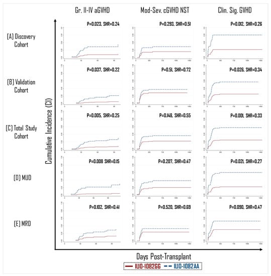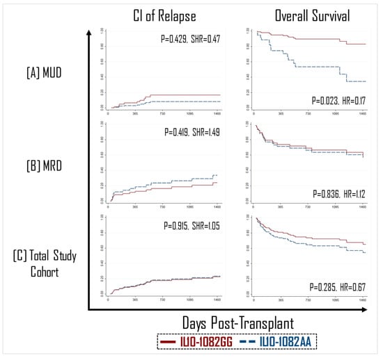 In general, the incidence of GVHD is expected to be greater in patients with a matched unrelated donor (MUD) than in those with a matched related donor (MRD) due alloreactivity linked with other immunogenetic factors such as mismatches at minor-histocompatibility loci [,]. Therefore, we theorized that the protective effect of the IL-10-1082GG allele would be most pronounced in the MUD setting. In transplants performed with an MUD graft (n = 157), recipients of an IL-10-1082GG genotype graft appeared to have significantly better protection against the development of grade II–IV aGVHD (p = 0.008, SHR = 0.15) and sGVHD (p = 0.021, SHR = 0.27) (Figure 1). However, in patients with an MRD graft (n = 158), there was no statistically significant difference in GVHD incidence between recipients of the -1082GG vs. AA genotype (Figure 1).