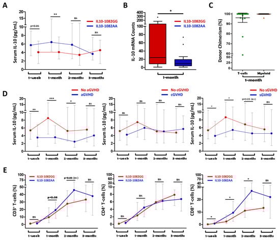 Recipients of an IL10-1082GG graft had greater serum IL10 levels at 1 week and 1 month post-transplant compared to recipients of an IL10-1082A graft (A). Recipients of IL10-1082GG grafts demonstrated higher IL10 mRNA counts at 1 month post-transplant (B). Complete (>95% donor) chimerism in both T-cells and myeloid cells supports a predominant donor-IL10-genotype effect on IL10 mRNA and serum cytokine levels (C). Higher serum IL10 levels were associated with a lower incidence of aGVHD and sGVHD, but not cGVHD (D). Recipients of an IL10-1082GG graft had a relatively attenuated population of CD8+ T-cells compared to IL10-1082AA graft recipients (E). “*” = p < 0.05; “**” = p < 0.01; “***” = p < 0.001; “ns” = not statistically significant.