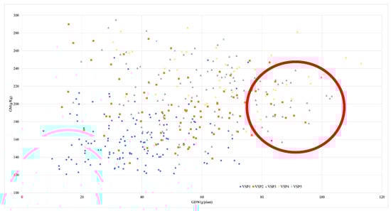 Comparison of early senescence and late senescence genotypes with agronomical traits. GM—grain moisture in grams/plant; GDW—grain dry weight in grams/plant; VSP1—genotypes correspond to a visual scale of plant value 1 (completely dry) at 45 DAA; VSP2—genotypes correspond to a visual scale of plant value 2 (partial green) at 45 DAA; VSP3—genotypes correspond to a visual scale of plant value 3 (intermediate green, intermediate dry) at 45 DAA; VSP4—genotypes corresponds to a visual scale of plant value 4 (partial dry) at 45 DAA; VSP5—genotypes corresponds to a visual scale of plant value 5 (complete green) at 45 DAA; Red circle—exceptional genotypes to the relationship between plant visual scale and grain moisture and yield.