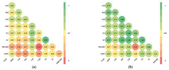 Correlation of traits with significance of p > 0.05. (a) Phenotypic correlation; (b) genotypic correlation. Trait: VSP—visual scale of the plant at 45 DAA; VSH—visual scale of husk leaves at 45 DAA; PHVDIF—the difference between the visual scale of plant and husk at 45 DAA; PA—photosynthesis activity at 45 DAA; SC—stomatal conductance at 45 DAA; GDW—grain dry weight; RDW—residual dry weight; GM—grain moisture; RM—residual moisture.