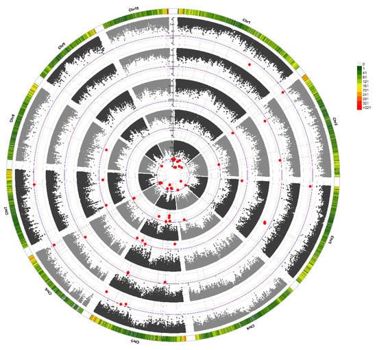 Circular Manhattan Plot. Red dots are significant SNPs for corresponding senescence traits. From inside to out: VSH—visual scale of husk leaves at 45 DAA; VSP—visual scale of plant at 45 DAA; SC—stomatal conductance; PHVDIF—the difference between the visual scale of plant and husk at 45 DAA; PA—photosynthesis activity at 45 DAA.