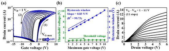 Figure 2a shows that the changes in the double-sweep transfer curves measured as the maximum gate voltage (VG_max) was increased from 1 to 10 V in 1 V increments. Upon performing a forward sweep, protons in the electrolyte migrated to the electrolyte/IGZO channel interface; however, in case of a backward sweep, the protons slowly return to their original position, resulting in counterclockwise hysteresis. With increase in the applied VG_max, an increased number of protons migrated to the interface in proportion to VG_max, thereby increasing the relaxation time. Eventually, the hysteresis window increased linearly with VG_max. Figure 2b shows the threshold voltage (Vth) and hysteresis window extracted from the transfer curves for VG_max. It is evident that Vth is fixed at −0.2 V regardless of VG_max, whereas the hysteresis window increased from 2.85 to 10.35 V with a gradient and linearity of 0.83 v/v and 99.73, respectively. Figure 2c shows the output characteristic curves measured at 1 V intervals from 0 to 6 V of the drain voltage (VD) while increasing VG–Vth from 1 to 11 V. With increase in VD, the drain current (ID) increased linearly and then gradually reached saturation. Further, with the increase in VG–Vth, ID increased, thus exhibiting the typical output characteristics of n-type FETs.