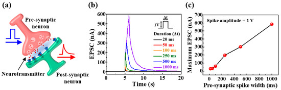 (a) Schematic of biological neuron and synapse; (b) excitatory post-synaptic currents (EPSCs) generated by pre-synaptic single-spike (1 V amplitude) for various durations (20 to 1000 ms); and (c) maximum EPSC as a function of pre-synaptic pulse duration.
