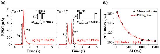 In the biological nervous system, paired-pulse facilitation (PPF) exhibits short-term synaptic plasticity and is crucial to real-time decoding of temporal information in auditory or visual signals [32]. In a pair of consecutively applied pulses, the EPSC evoked by the spike increases when the second spike closely follows the previous one [33]. Figure 4a shows the paired-pulse-facilitated EPSC when applying two pulses with 1 V amplitude and 100 ms duration, with time intervals of 50 and 500 ms. In both cases, the second EPSC (A2) increased compared to the first EPSC (A1); however, the increase in A2 reduced at longer time intervals (Δtinterval) between pulses. This was because of the relaxation time of the induced protons and the time interval between the two pulses. Upon the application of the first spike, the protons accumulated at the electrolyte/channel interface, resulting in a channel current. Following the pulse, the accumulated protons underwent a relaxation process from the interface over time. However, if Δtinterval was shorter than the complete relaxation time of the proton, the residual proton contributed to channel conduction, combined with proton accumulation by the second pulse [34]. Consequently, the longer the Δtinterval between pulses, the more fully relaxed the protons, thereby decreasing A2. The amplification factor of EPSCs was defined as the PPF index (A2/A1), and Figure 4b shows the measured PPF index for pulses with time intervals in the range of 50 to 1500 ms. A high PPF index of 163.2% was extracted for a short Δtinterval of 50 ms; however, this decreased with increase in the time interval between pulses, resulting in a PPF index of ~102% for a long Δtinterval of 1500 ms. Therefore, the second EPSC(A2) and the first EPSC(A1) were observed to became approximately equal with an increase in the time interval between pulses. These results indicate that the potato-starch EDL transistors can implement short-term synaptic plasticity. The PPF index was fitted using the following double-exponential decay relationship [35]: