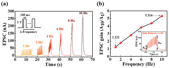 (a) EPSCs by applying ten consecutive pre-synaptic spikes with different frequencies and (b) EPSC gain (A10/A1) according to different applied spike frequencies.