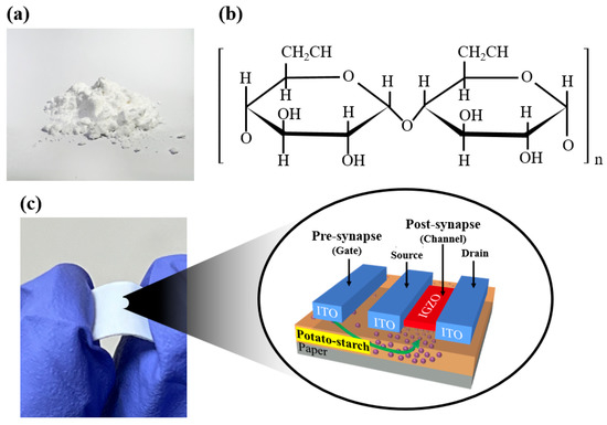 (a) Photographic image of potato-starch powder for electrolyte membrane formation of synaptic transistors; (b) molecular structure representing repeating units of potato starch. (c) Photographic image of the paper substrate on which the synaptic device is formed and a schematic diagram of the fabricated coplanar gate type artificial synaptic transistor.