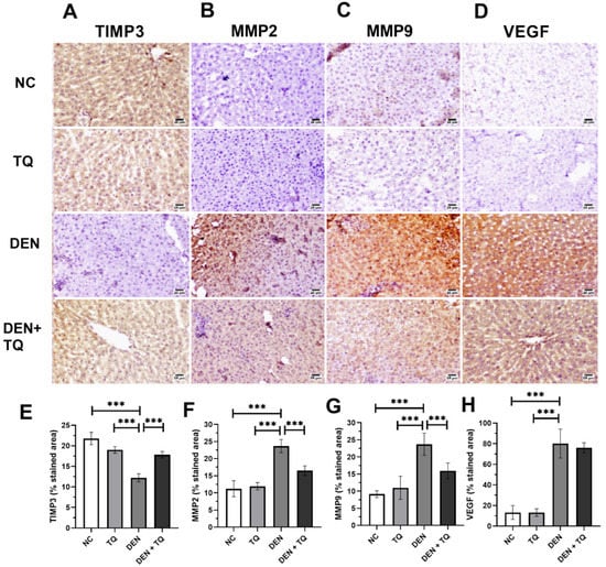 The role of TQ in DEN-induced carcinogenesis was confirmed in our previous paper by histopathology, liver function tests and the measurement of HCC biomarkers [18]. To know the status of the angiogenic biomarkers, liver tissues were sectioned for immunohistochemical staining to examine TIMP3, MMP2, MMP9, and VEGF (Figure 1A–D). Our result clearly illustrated a normal expression in the hepatic parenchyma of the negative control (NC) and TQ groups. A high expression of MMP2, MMP9, and VEGF was obvious in DEN-intoxicated rats but the expression of TIMP3 was lowered compared to the negative control and TQ groups (p < 0.0001). In rats pretreated with TQ, a decreased expression status of MMP2, MMP9 and VEGF, and increased expression of TIMP3 were obvious (Figure 1E–H).