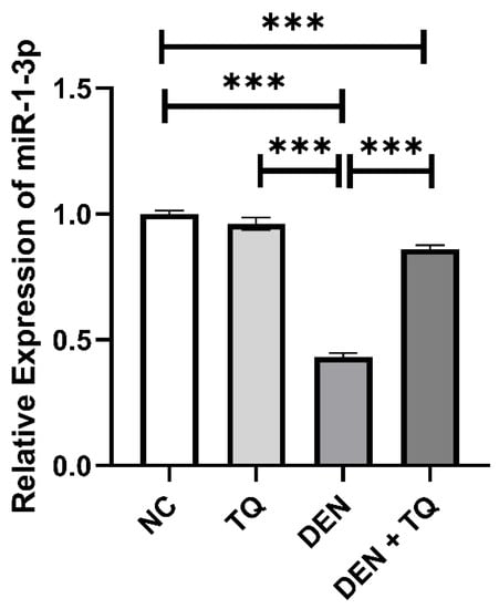 The effect of TQ on miR-1-3p was explored by measuring its expression in rat liver tissue. The results of qRT-PCR analysis revealed significant downregulation of miR-1-3p in DEN-intoxicated rats compared to the negative control group. Moreover, pretreatment of rats with TQ prominently upregulated miR-1-3p compared to the DEN-injected group (Figure 2).