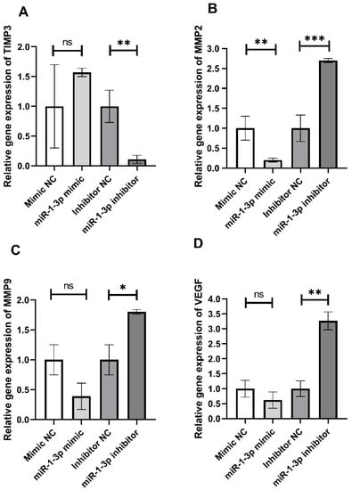 To confirm that the antimigratory effect of TQ is regulated by miR-1-3p, HepG2 cells were treated with miR-1-3p mimic or inhibitor or their corresponding controls. Then, the gene expression levels of the angiogenesis biomarkers, TIMP3, MMP2, MMP9, and VEGF, were measured (Figure 3). Treating cells with miR-1-3p mimic led to a non-significant upregulation of TIMP3 (p = 0.23); however, MMP2, MMP9. and VEGF were downregulated (p < 0.001 *, MMP2; p = 0.14, MMP9; p = 0.3, VEGF) when compared to the mimic negative control. On the other hand, cells treated with miR-1-3p inhibitor showed a significant increase in the expression levels of MMP2, MMP9, and VEGF at p < 0.0001, 0.01, and 0.001, respectively. On the contrary, inhibiting miR-1-3p decreased the TIMP3 level at p < 0.001 when compared to its inhibitor negative control.