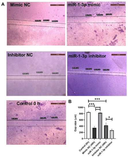 To further investigate the effect of miR-1-3p on cell migration, its role in inhibiting HepG2 cell migration was elucidated using an in vitro wound healing assay for 48 h (Figure 4A). The wound in the mimic and inhibitor controls was healed 48 h after scratching a monolayer of cells. HepG2 cells treated with mir-1-3p mimic showed a significant delay in the wound healing of the scratched area compared to its corresponding control at 48 h. The mimic significantly increased the wound gap by 137.6% at p < 0.001. On the other hand, treating HepG2 cells with miR-1-3p inhibitor hastened the wound closure, decreasing the gap by 36.6% at p < 0.05 when compared to the inhibitor negative control (Figure 4B).