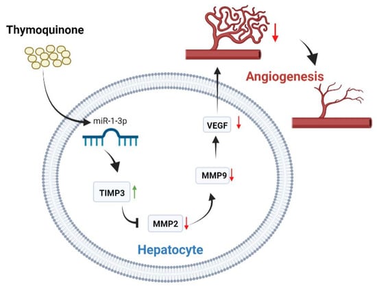 To further confirm the anti-angiogenic effect of miR-1-3p, HepG2 cells were treated with miR-1-3p mimic or inhibitor or their corresponding controls. Then, the expression levels of the angiogenesis biomarkers, TIMP3, MMP2, MMP9, and VEGF were measured. Treating the cells with miR-1-3p mimic led to a non-significant upregulation of TIMP3; however, MMP2, MMP9, and VEGF were downregulated when compared to the mimic negative control. On the other hand, cells treated with miR-1-3p inhibitor showed a significant increase in the expression levels of MMP2, MMP9, and VEGF, with a significantly decreasing TIMP3 level when compared to its inhibitor negative control. Moreover, inhibition of miR-1-3p led to an increase in the cell migratory effect in the wound healing assay. Cell migration is essential to angiogenesis and is considered one of the main underlying mechanisms of angiogenesis [44]. The suggested mechanism by which TQ inhibits angiogenesis is illustrated in Figure 5.