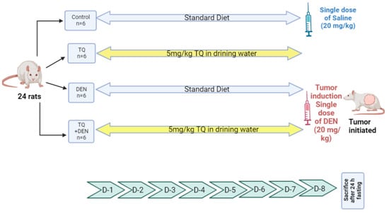 Experimental design. Twenty-four rats were divided into 4 groups (n = 6). Group 1 (negative control group): the rats had a regular diet and received saline ip on the 8th day. Group 2 (TQ group): Received TQ for 7 days at a dose of 5 mg/kg/day in their drinking water. Group 3 (DEN control): received a standard diet for 7 days. Group 4 (DEN + TQ): Received TQ (5 mg/kg/day) in their drinking water for 7 days. Both group 3 & 4 had DEN ip on the 8th day at a dose of 200 mg/kg.