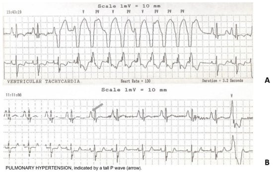 Cardiac Holter tracing. The record shows ventricular tachycardia with a heart rate of 130 bpm (A) and pulmonary hypertension highlighted by pulmonary P waves (B).