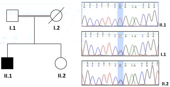 Family pedigree and Sanger analysis. In the family pedigree, a black box indicates the young affected male, born to consanguineous parents. A custom gene panel, MotorPlex, showed a homozygous truncating variant in DES gene [NM_001927.3: c.634C>T; p. Arg212*]. Sanger sequencing and segregation studies confirmed the identified DES variant in homozygosity in our patient (II.1) and in heterozygosity in the proband’s father and sister, both healthy (I.1 and II.2). The mother’s DNA was not available.