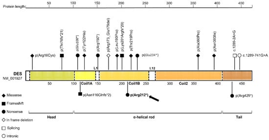 Structural organization of the human desmin and graphical representation of the distribution of bi-allelic variants in DES gene. The arrow indicated the variation found in our patient. The different domains and segments of desmin, are painted with distinct patterns. Homozygous and compound heterozygous bi-allelic mutations are aligned according to their location, over the entire DES gene. Nonsense, missense, frameshift, deletions, splicing and intronic mutations are reported in the protein graph using different symbols.